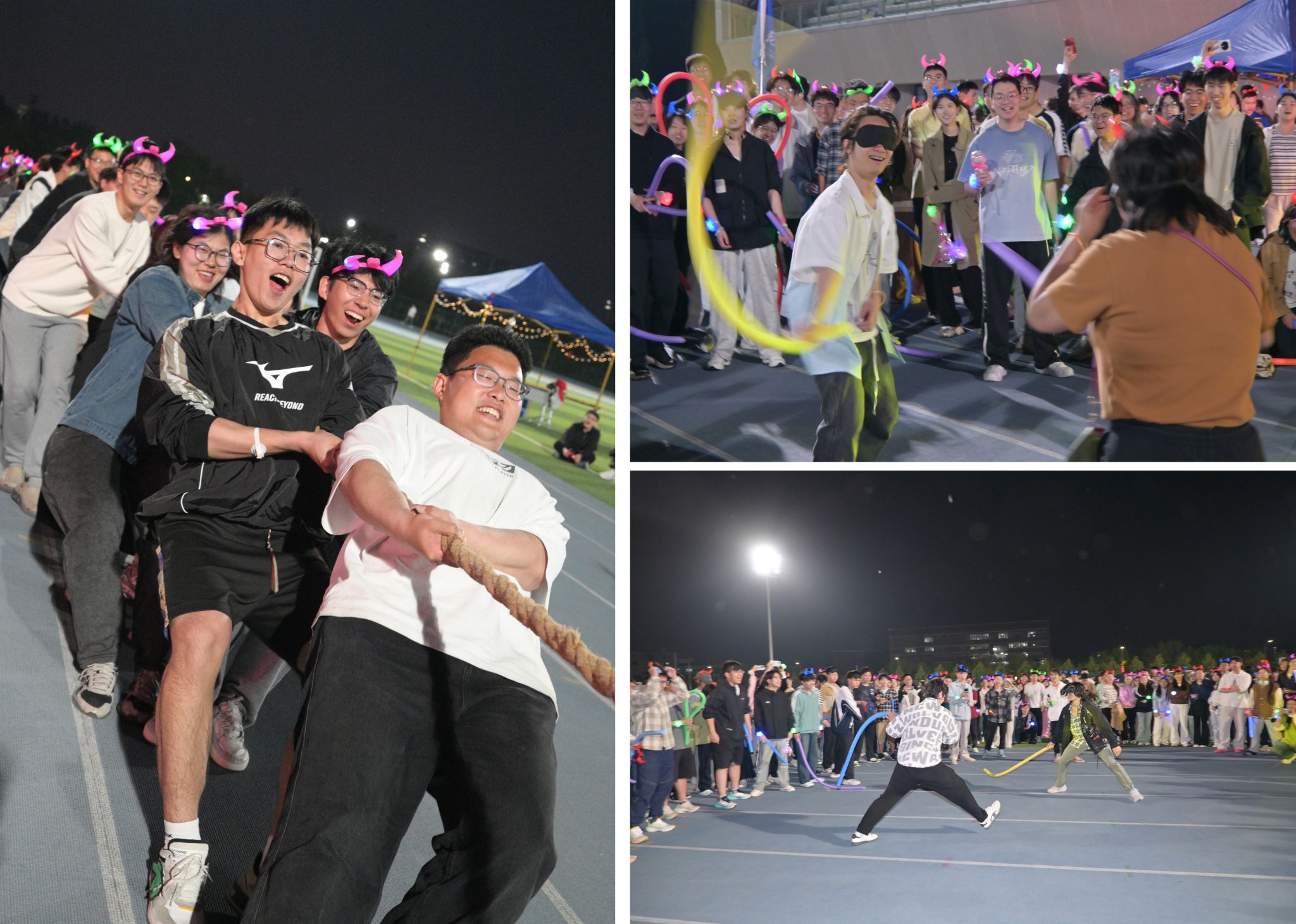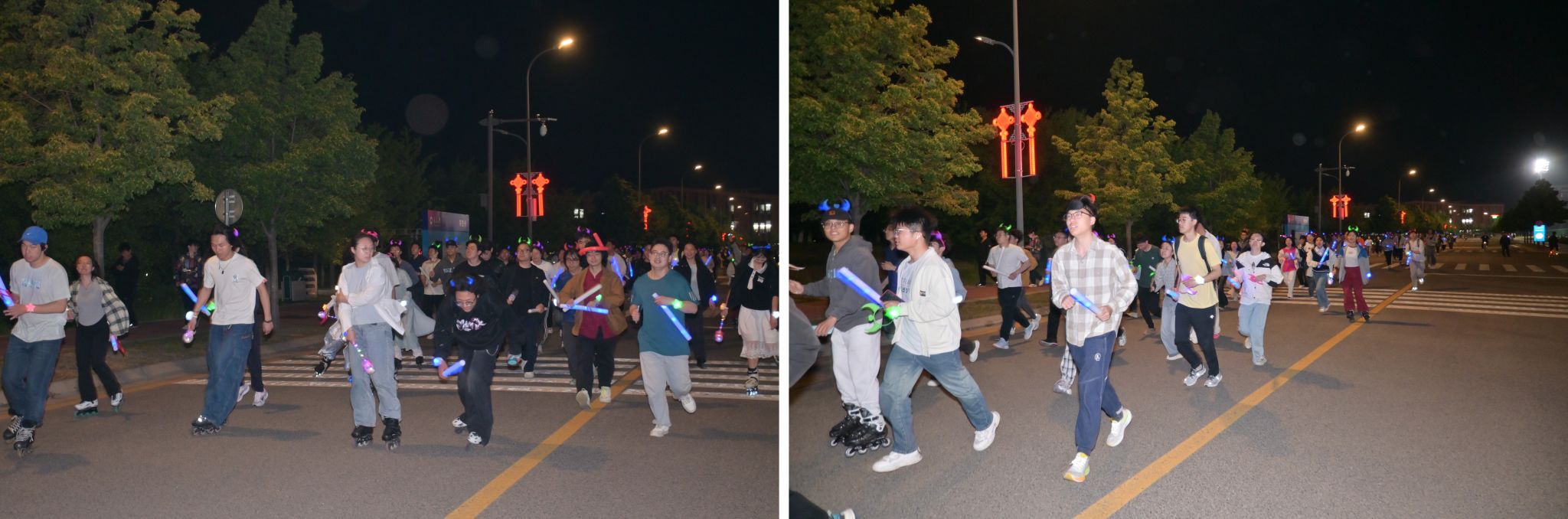 活动分设内场荧光欢动与荧光乐跑两大环节。在荧光欢动环节,设置百人拔河、跳大绳、盲人剑客等大型素拓活动,学生参与热情高,现场氛围热烈。在荧光乐跑环节,20余名轮滑社成员领跑,800余名学生分成五支队伍,按照规定路线依次打卡风雨操场、图书馆、生命学馆、一号教学楼、学生中心、文管学馆等多个地点完成跑步任务。