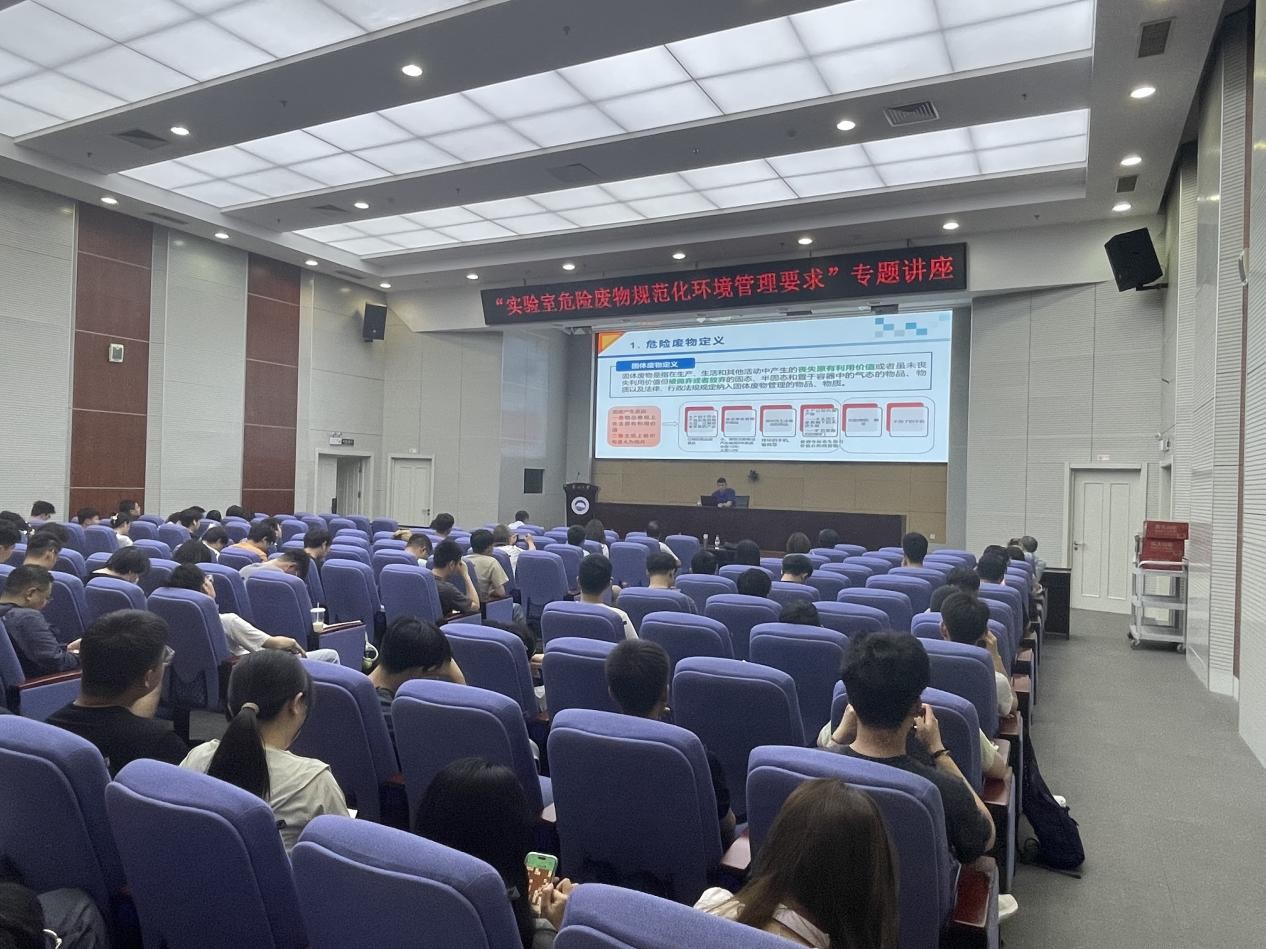 陈明从危险废物的概念界定、分类贮存、应急处置、台账记录、转运规范、法律法规以及典型案例等管理要点进行了细致的解读,为实验室危废管理和制度规范正确落地落实提供了切实的帮助。陈明还围绕师生关心的实验室危险废物问题与在场师生进行了互动交流,为学校危险废弃物安全处置工作提供了建设性意见。