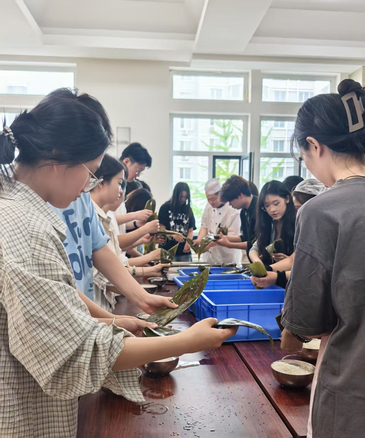 活动开始,22级本科生杨徵羽同学介绍了端午节的由来与习俗,拉开了文化序幕。同学们在食堂师傅指导下,沉浸式体验了选叶、泡米、包裹、到捆扎、蒸煮的全过程,并品尝了粽子,感受劳动成果的喜悦。