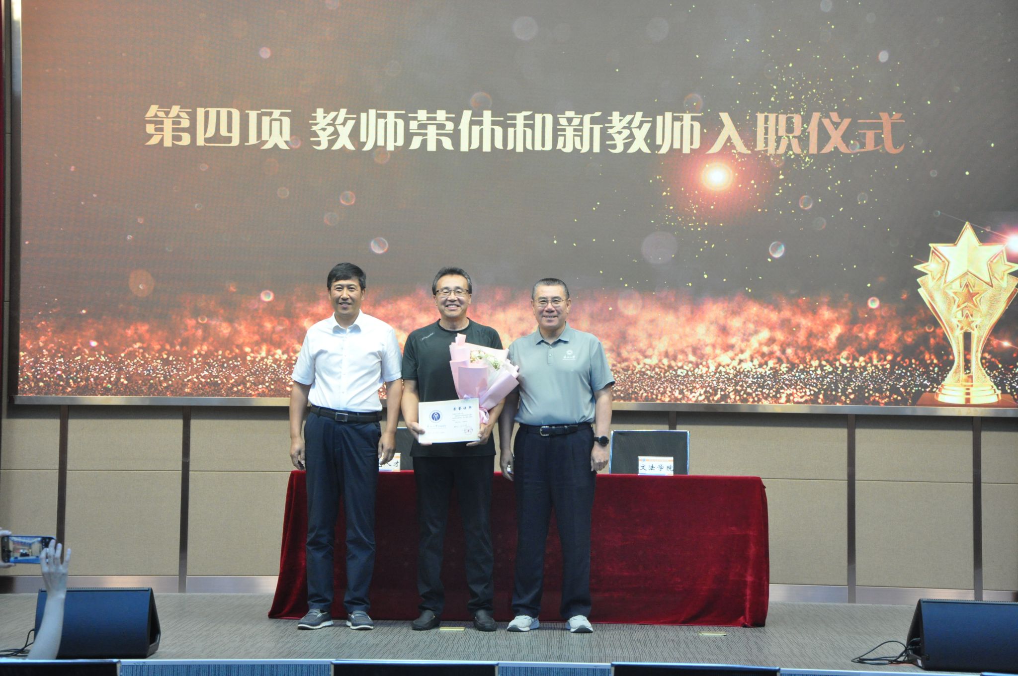 会议开展了教师荣退和新教师入职仪式。仪式上,学院教师共同回顾了宋官东老师、李兆友老师、周建民老师和徐建老师在文法学院工作的点滴。隋永强和杜宝贵为退休教师代表周建民老师颁发荣退证书,全体教师向退休教师们致以崇高敬意和真挚祝福。