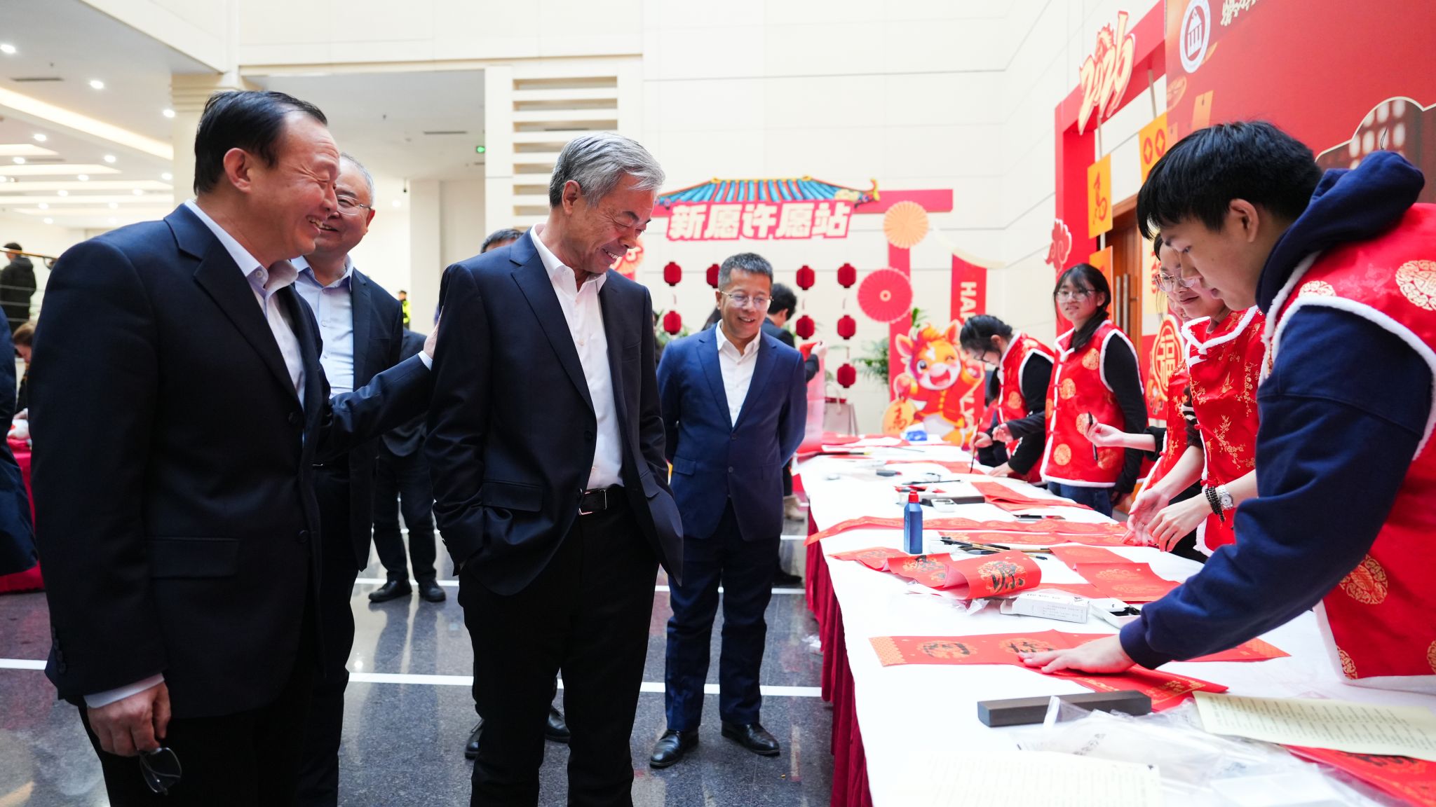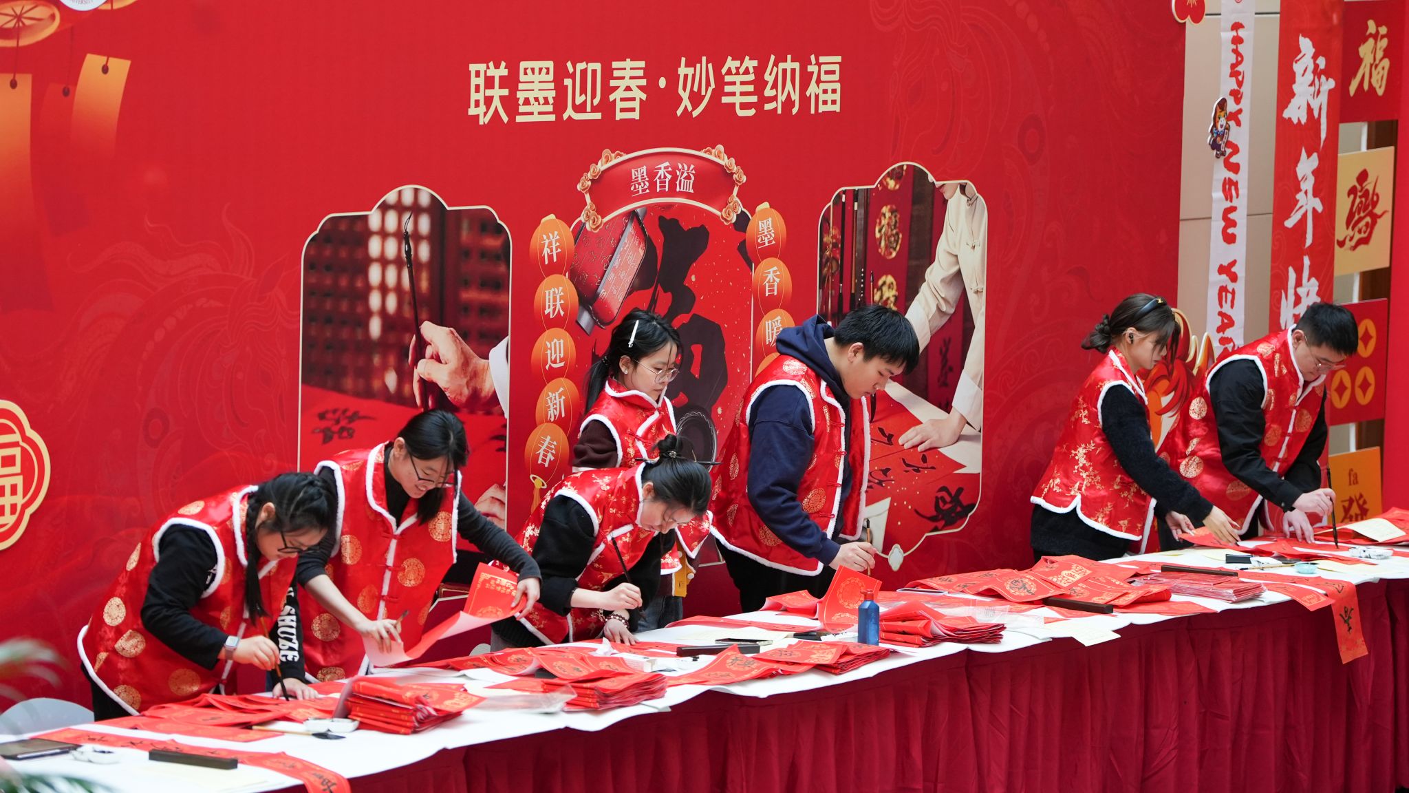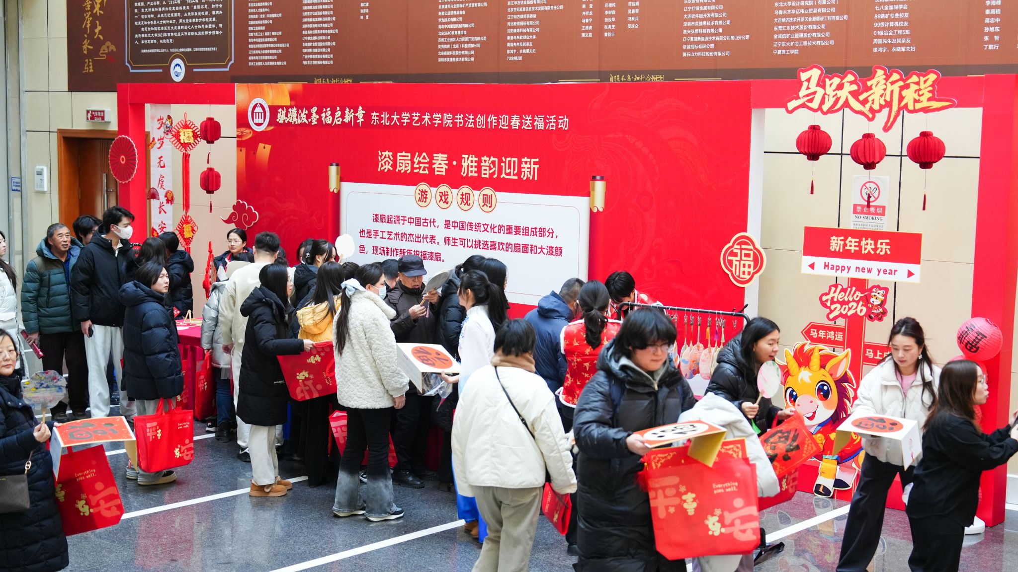 汉卿会堂一楼大厅打造了“福启新章”“联墨迎春”“漆扇绘春”三大特色创作区域。活动现场暖意融融、氛围热烈,师生们或潜心创作、或驻足品鉴、或交流探讨,一幅幅春联、一个个福字、一柄柄画扇承载着满满新春期许,欢声笑语与笔墨书香交织相融,绘就出一幅其乐融融的迎新图景。