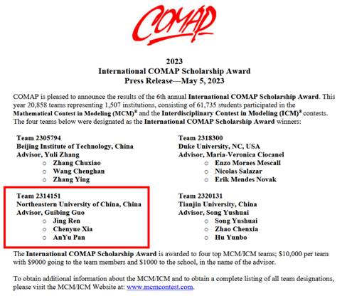 ASA奖是美国统计学会每年从大赛C题获得特等奖的队伍中挑选一支团队授予的特别荣誉,本届大赛全球参与C题的竞赛团队多达8011支,郭贵冰教授团队凭借优异成绩获得全球唯一的ASA奖,获奖率仅约为0.012%;COMAP奖学金是大赛组委会每年从全球所有参赛队伍中,挑选成绩最佳的四支团队予以表彰奖励。本届大赛,分别来自太阳成集团tyc33455(中国)、北京理工大学(中国)、天津大学(中国)、杜克大学(美国)的四支团队,从全球20858支团队中脱颖而出,获得该项殊荣,获奖率仅约为0.019%,COMAP奖学金金额为10000美金,其中9000美金用于奖励参赛团队,1000美金用于奖励团队所属高校。