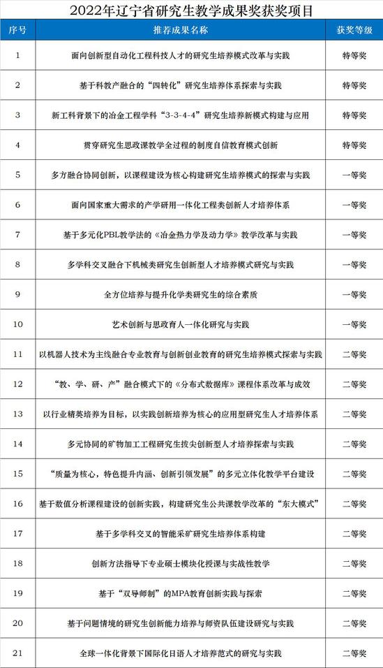 近日,辽宁省教育厅公布了2022年辽宁省研究生教学成果奖获奖结果。我校推荐申报的21项研究生教学成果全部获奖,其中特等奖4项,一等奖6项,二等奖11项。高级别奖项数量和获奖总数均创历届申报新高。