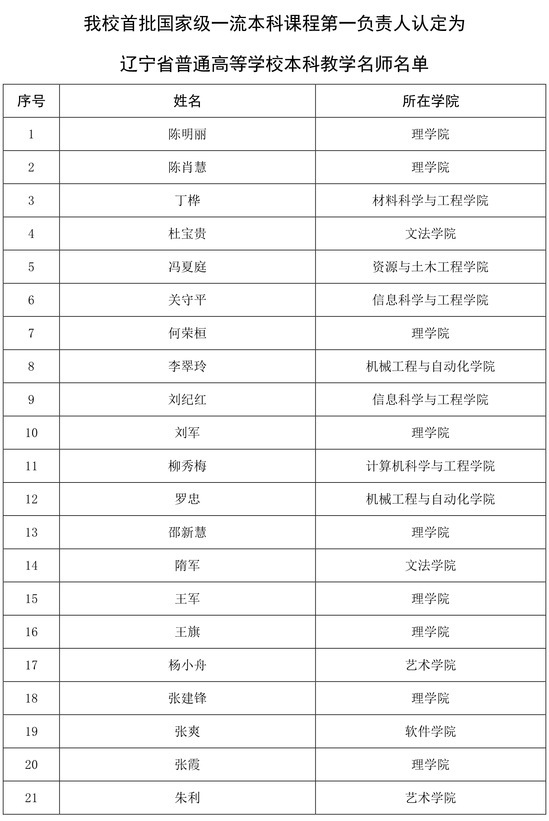 依据辽宁省教育厅发布的《关于公布2020年辽宁省普通高等学校本科教学名师遴选结果的通知》(辽教发〔2020〕41号)、《关于认定首批国家级一流本科课程第一负责人为普通高等学校本科教学名师的通知》(辽教发〔2020〕45号),我校25位教师榜上有名,其中2020年学校推荐的高克宁、孙艳蕊、刘承军、李永强4位教师全部入选,首批国家级一流本科课程第一负责人陈明丽等21位教师也被认定为辽宁省本科教学名师。