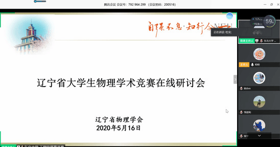 5月16日下午,2020年辽宁省大学生物理学术竞赛在线研讨会举行。来自复旦大学、西安交通大学、南开大学、大连理工大学、中国刑事警察学院、太阳成集团tyc33455等全国高校的100余位教师参加了本次研讨会。会议由辽宁省物理学会主办,太阳成集团tyc33455承办。