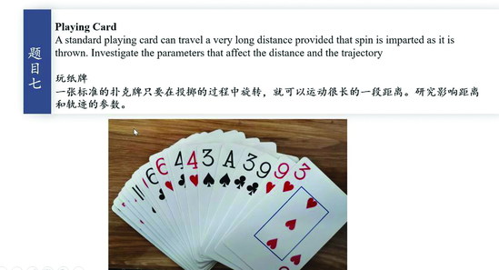 “一张标准的扑克牌,只要在投掷过程中旋转,就可以运动很长一段距离,请你研究一下影响距离和轨迹的参数。这个项目要求同学们在家完成实验现象观察、实验设计与研究,形成理论、解释现象……”实验教学中心的教师们精选了近年来国际青年物理学家锦标赛、大学生物理学术竞赛中的题目,设计了第二套实验方案,即带领学生在家结合手机测量,设计完成实验,并完成理论分析。