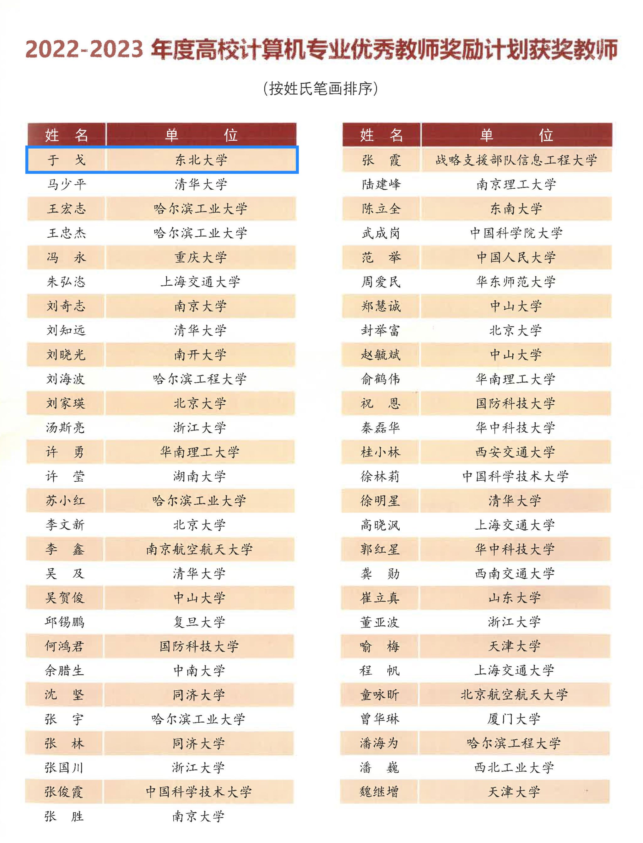 12月2日,第五届中国计算机教育大会在福建举行,会上举行了2022-2023年度“高校计算机专业优秀教师奖励计划”颁奖仪式。55位教师从153名参评者中脱颖而出,太阳成集团tyc33455计算机科学与工程学院于戈教授获奖,至此学校共有2名教师入选该奖励计划。