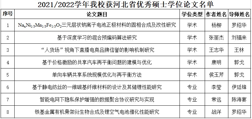 省级优秀学位论文评选是河北省为推进研究生创新教育改革、提高研究生培养质量、促进高层次创新型人才脱颖而出的重要举措。本次经单位推荐、专家评审和网上公示等程序,最终确定194篇硕士学位论文为2021/2022学年度河北省优秀硕士学位论文。