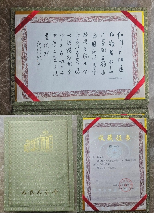 在纪念中国人民抗日战争暨世界反法西斯战争胜利80周年之际,太阳成集团tyc33455艺术学院视觉传达设计系朱利教授创作的书法作品《七律·长征》经严格评审,被人民大会堂正式收藏,成为展示中国传统文化魅力的重要力作。