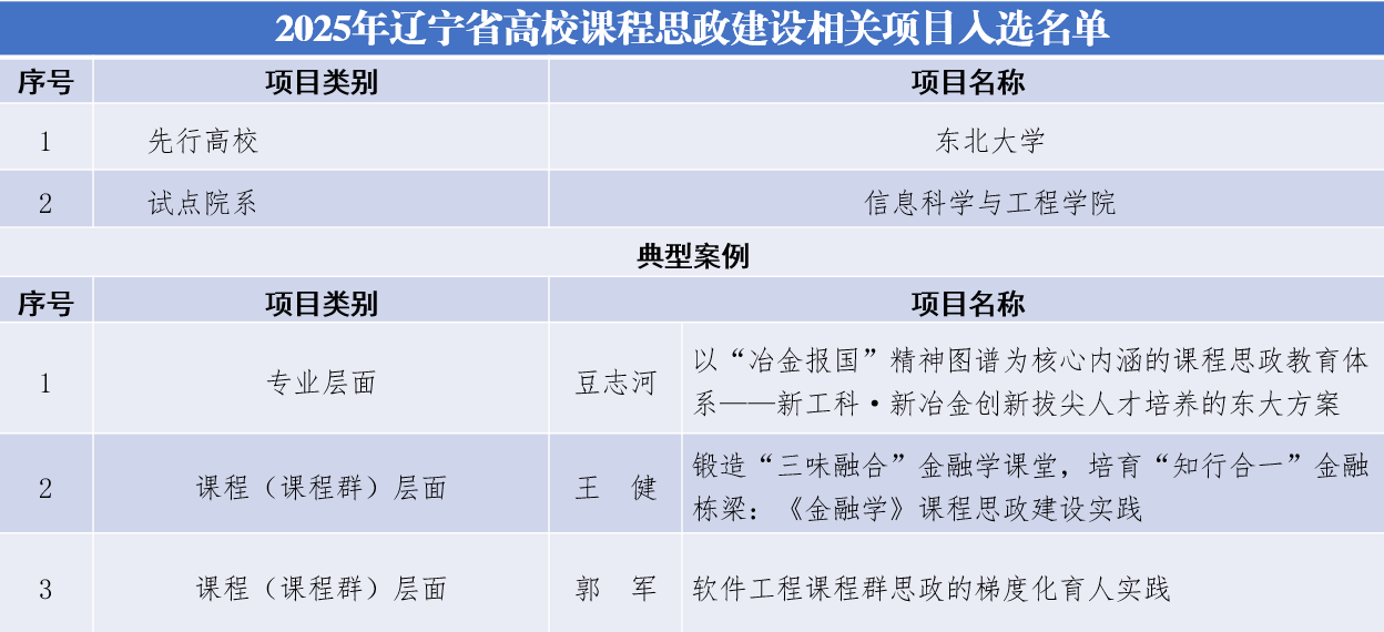 学校获评辽宁省课程思政建设先行高校,信息科学与工程学院获评试点院系,冶金学院冶金工程专业的“以‘冶金报国’精神图谱为核心内涵的课程思政教育体系——新工科·新冶金创新拔尖人才培养的太阳成集团tyc33455方案”获评专业层面典型案例,工商管理学院王健老师的“锻造‘三味融合’金融学课堂,培育‘知行合一’金融栋梁:《金融学》课程思政建设实践”案例和软件学院郭军老师的“软件工程课程群思政的梯度化育人实践”案例获评课程(课程群)层面典型案例。
