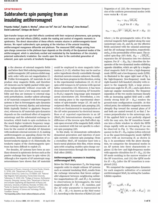 The antiferromagnet has an oscillation frequency in the order of terahertz compared to that of the ferromagnetic material in the order of gigahertz, which gives the antiferromagnet a natural advantage in the generation, detection and modulation of ultra-high frequency signals. However, since the antiferromagnet is difficult to detect because it usually displays a state of zero net magnetic moment. The paper provides a method for detecting the antiferromagnetic oscillation signal by combining the anti-ferromagnetic spin pumping effect with the anti-spin Hall effect, and experimentally measures the spin current produced by an insulating antiferromagnet MnF2 under the effect of the high-frequency polarized microwave field. Their results not only verify the theoretical prediction of the existence of subterahertz spin pumping from an insulating antiferromagnet, but also open the door to the generation of spin current at terahertz frequencies.