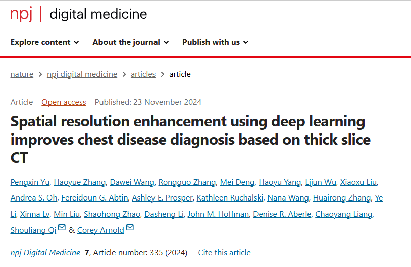 Recently, the team led by Professor Shouliang Qi from the College of Medicine and Biological Information Engineering of NEU, in collaboration with the University of California, Los Angeles (UCLA), published a research paper titled "Spatial resolution enhancement using deep learning improves chest disease diagnosis based on thick slice CT" in npj Digital Medicine, a top global digital medicine journal (a sub-journal of Nature). Pengxin Yu, a 2023 Doctoral Student of NEU, and Haoyue Zhang from the National Institutes of Health are the co-first authors, and NEU is the first completion unit. Professor Shouliang Qi and Professor Corey Arnold from UCLA are the co-corresponding authors.