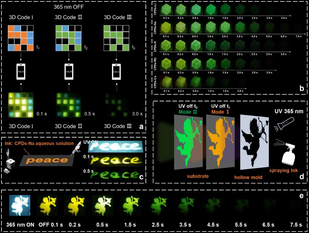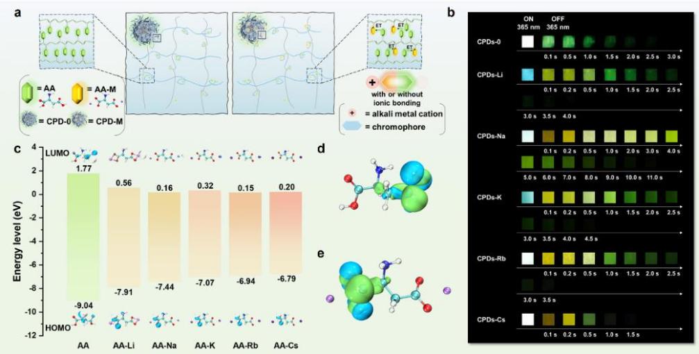 This paper reported a high-contrast TDPC carbide polymer dot material with regulable lifetime. Simple pyrolysis of aspartic acid and alkali metal ions were conducted by a novel and synthetically friendly strategy, hence introducing ionic bonds into such self-protected CPDs. DFT calculations and structural characterization confirm the modulating role of high-density ionic bonding in the triplet state energy levels of the chromophores, to achieve the stable existence of green phosphorescent and red phosphorescent luminescent centers in CPDs. Moreover, the luminescence lifetimes of such materials (from tens of milliseconds to hundreds of milliseconds) can be precisely modulated according to the heavy-atom effect and cross-linking-enhanced emission (CEE) effect. Simultaneously, the effective radiative energy transfer can also be used to better understand the intrinsic mechanism of TDPC materials, further expanding the fundamentals of designing high-quality TDPC materials and enabling more flexible modulation of luminescent properties, and taking an important step to broaden the range of intelligent phosphorescence applications.