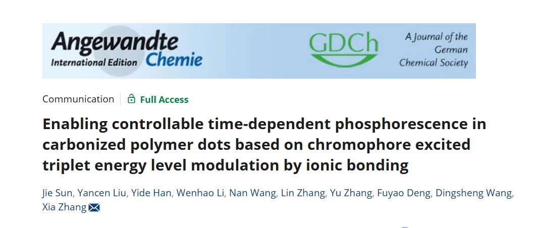 Recently, Professor Zhang Xia and her team from College of Sciences, NEU, have published an online research paper titled “Enabling controllable time-dependent phosphorescence in carbonized polymer dots based on chromophore excited triplet energy level modulation by ionic bonding” in the prestigious chemical journal Angewandte Chemie International Edition.