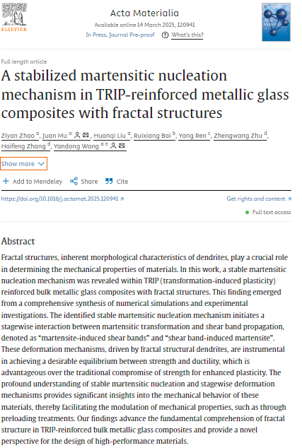 On March 14, the research group of Professor Mou Juan and Professor Wang Yandong from the College of Materials Science and Engineering, NEU published a paper entitled " A stabilized martensitic nucleation mechanism in TRIP-reinforced metallic glass composites with fractal structure " online on Acta Materialia, a top international academic journal in the field of materials. The NEU is the first unit of the paper, Zhao Ziyan, the 2019-grade Doctor of the School of Materials Science and Engineering and the current post-doctor of the School of Metallurgy, as the first author, and Professor Mou Juan and Professor Wang Yandong of the College of Materials Science and Engineering as joint corresponding authors. In addition, Advanced Metastable Metal Materials Research Center of NEU, Dalian University of Technology, Argonne National Laboratory and State Key Laboratory for Advanced Metals and Materials of University of Science and Technology Beijing are cooperative research units.