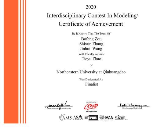 Recently, the results of the 2020 MCM/ICM were announced. Students of NEU at Qinhuangdao won one “Finalist”, eight “Meritorious Winner” and 33 “Honorable Mention”.