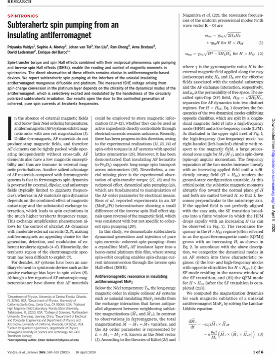 Recently, Professor Liu Yan from the Department of Physics of College of Science, NEU published a paper on internationally renowned journal Science, titled Subterahertz Spin Pumping from an Insulating Antiferromagnet as a co-author.