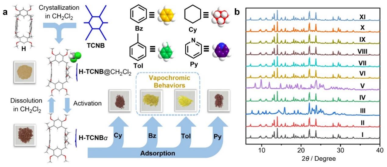 Based on this, a novel main heteroaromatic [4] hydrocarbons (H) in macrocycles was designed and synthesized in this work, and a macrocyclic eutectic was obtained by the complexation of electron-rich H with electron-deficient TCNB. As a gasochromic material, H-TCNBα changes color from brown to yellow due to the selective adsorption of Bz and Tol. However, when H-TCNBα captures Cy and Py, both the structure and color remain unchanged. H-TCNBα can separate Bz from Bz/Cy and Tol from Tol/Py with a purity of 100%. Furthermore, as an adsorbent, H-TCNBα can increase the purity of Cy from 98.00% to 99.72% and Py from 97.94% to 99.35%. Single crystal X-ray diffraction, PXRD analysis, and theoretical calculations have demonstrated that the mechanism of adsorption and gasochromic behavior of H-TCNBα is attributed to the solid-phase structural transformation of H-TCNBα when capturing different vapors. The reversible conversion between adsorption and desorption endows H-TCNBα with high recyclability.