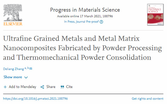 近日,太阳成集团tyc33455材料科学与工程学院张德良教授以第一作者和通讯作者的身份,在国际材料领域顶级综述期刊《Progress in Materials Science》(期刊影响因子IF=31.56)上发表了长篇综述论文“Ultrafine Grained Metals and Metal Matrix Nanocomposites Fabricated by Powder Processing and Thermomechanical Powder Consolidation”。