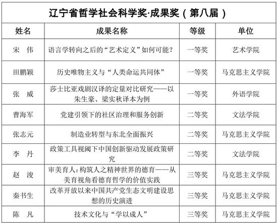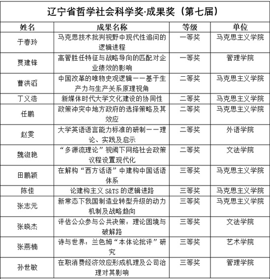 辽宁省哲学社会科学奖・成果奖是辽宁省人文社科领域高层次科研奖励,本次两届奖项同时评审。该奖励推进哲学社会科学各领域全面发展、服务辽宁全面振兴能力明显提高,鼓励广大哲学社会科学工作者为辽宁振兴发展服务,为实现中华民族伟大复兴中国梦贡献智慧和力量。