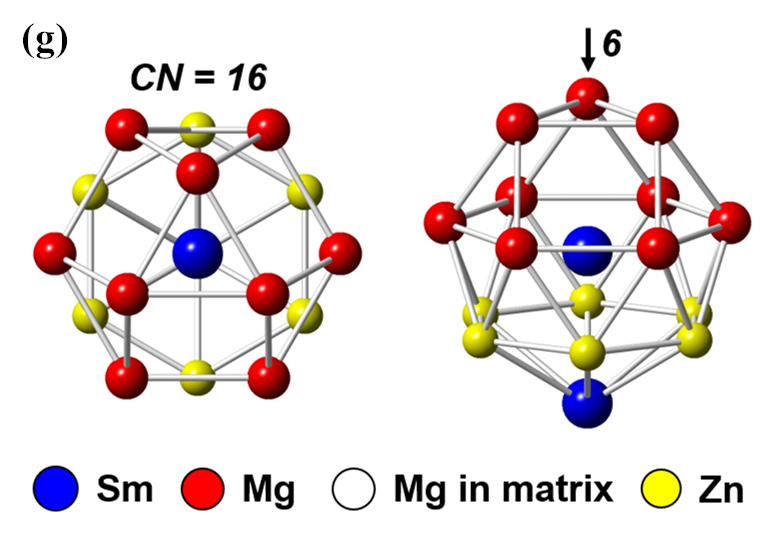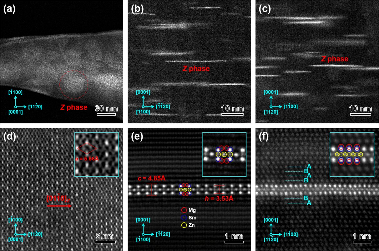 图2:(a-f)HAADF-STEM图像显示Mg-4Sm-2Zn合金200℃时效48小时后{0001}α基面内层嵌入了大量具有一个晶胞厚度的二维Frank-Kasper Z相,(g)二维Frank-Kasper Z相中Friauf多面体结构示意图
