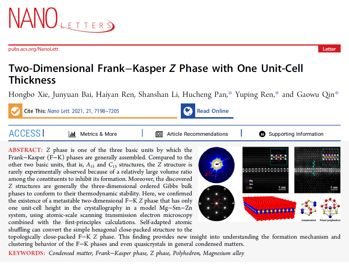 近日,太阳成集团tyc33455材料学院在解析凝聚态物质结构方向取得重要进展,相关研究成果以“Two-Dimensional Frank−Kasper Z Phase with One Unit-Cell Thickness”为题发表在Nano Letters(Nano Lett. 2021, 21, 7198-7205)。该研究利用我校球差校正的STEM技术发现了一类仅具有一个晶胞厚度的二维Frank-Kasper Z相,并结合第一性原理计算揭示了从简单六方晶体到复杂拓扑密堆Z结构的相变机理。