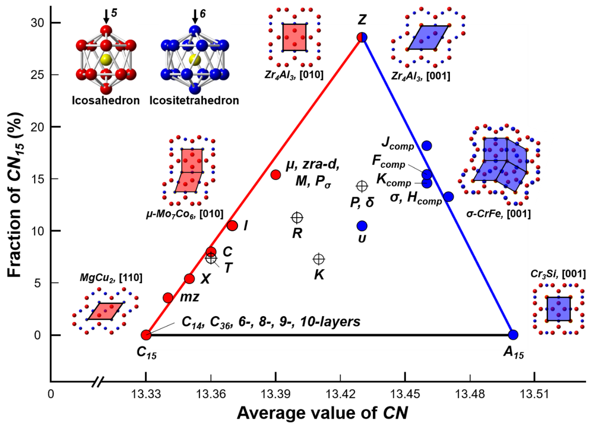 图1:Frank-Kasper相的平均配位数值(CN值)与其CN = 15体积分数的关系示意图。实验已发现的28种类型Frank-Kasper相都位于一个三角形中,而C15,A15和Z相3个基体结构单元则位于三角形的3个顶点。