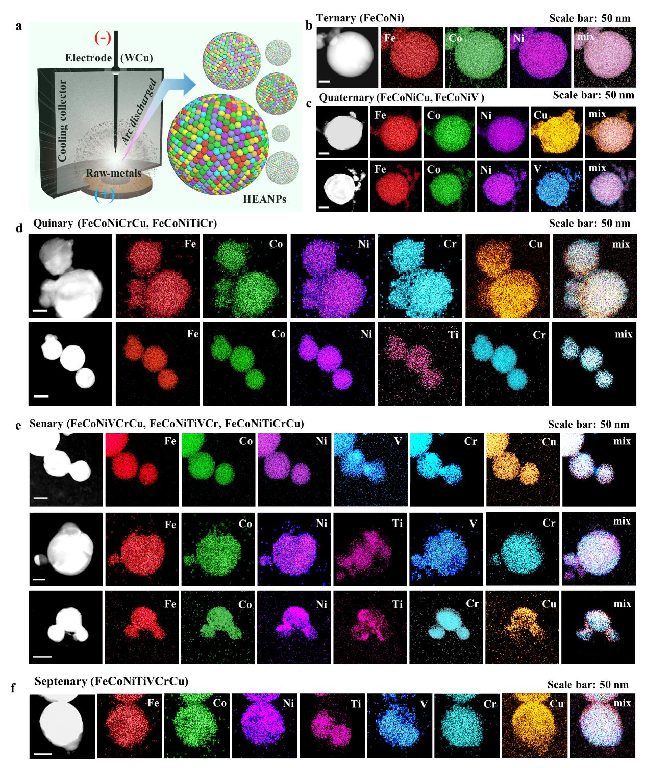图1 高熵合金纳米颗粒TEM-EDS mapping图像. (a) 制备方法示意图,(b)-(f) 高熵合金纳米颗粒TEM-EDS mapping图像.