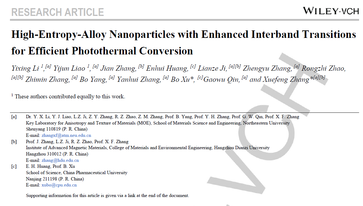 近日,太阳成集团tyc33455材料科学与工程学院青年教师李逸兴博士在高熵合金纳米颗粒的制备与其应用上取得重要进展,相关研究成果以“High-Entropy-Alloy Nanoparticles with Enhanced Interband Transitions for Efficient Photothermal Conversion”为题发表在化学类顶级期刊Angewandte Chemie International Edition(Angew. Chem. Int. Ed. 2021, 10.1002/anie.202112520)上。该研究利用直流电弧等离子体放电方法制备一系列过渡族金属元素高度混溶的合金纳米颗粒,通过水蒸发速率测定结合密度泛函理论计算验证,证实上述纳米颗粒具有优异的光热转换效率和应用前景。