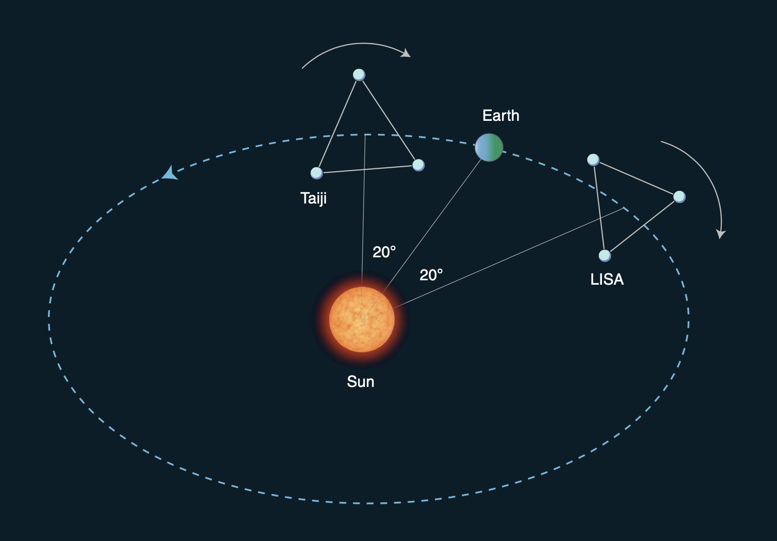 图:LISA-太极网络构型的示意图。【图片来源:W. H. Ruan, etal., Nature Astronomy 4, 108 (2020)】