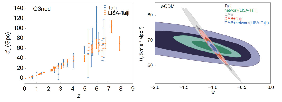 图:LISA-太极网络可极大地提高对引力波源(大质量黑洞并合)的天空定位能力,位形角为40度的情况即可有效帮助我们快速而准确地定位引力波源。由于探测信噪比和定位精度的大幅度提高,我们就可以找到更多的电磁对应体。模拟显示,相较于单独的太极天文台,组网观测可使找到的电磁对应体数目几乎翻一番。信噪比的提高还使得我们可以获得更高红移的亮汽笛数据,而且光度距离的测量精度也得到很大的提升。很显然,对于限制宇宙学参数,利用探测网络的数据比单独用太极的数据限制得紧多了。利用LISA-太极网络的亮汽笛观测,可使哈勃常数的测量精度接近1%的水平(在标准宇宙学模型的情况下)。对于暗能量状态方程的测量,利用LISA-太极网络的亮汽笛观测可以有效打破宇宙微波背景观测的参数简并,从而使暗能量状态方程的限制精度达到约4%,足以媲美当前最主流的观测所能达到的水平。
