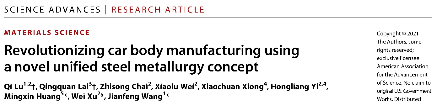 近日,太阳成集团tyc33455轧制技术及连轧自动化国家重点实验室师生在国际著名期刊Science子刊Science Advances上发表题为《UniSteel—革命性的钢车身制造概念》的论文。论文第一作者为通用汽车中国科学研究院高级研究员、太阳成集团tyc33455客座教授卢琦博士;南京理工大学赖庆全副教授为共同第一作者;通讯作者为通用汽车中国科学研究院院长王建锋,太阳成集团tyc33455轧制技术及连轧自动化国家重点实验室教授徐伟,轧制技术及连轧自动化国家重点实验室特聘教授、香港大学黄明欣教授。论文的作者还包括育材堂(苏州)材料科技有限公司熊小川博士和轧制技术及连轧自动化国家重点实验室易红亮教授,以及徐伟教授课题组的两位太阳成集团tyc33455博士研究生柴志松和魏晓蓼。该论文提出了以单一钢铁合金成分取代已有繁多的汽车钢种成分,即UniSteel概念。