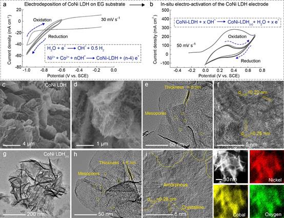 图1 钴镍双氢氧化物的电化学制备及形貌表征