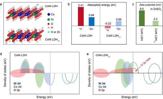 本文首次将过渡金属基双氢氧化物应用于温和水系锌离子电池。此工作的主要科学发现有:1)电化学诱导活化方法可破坏O-H键,在过渡金属双氢氧化物中引入氢空位;2)氢空位的引入,提升过渡金属基双氢氧化物导电性,改善其阳离子吸附热力学,提供丰富的阳离子嵌入活性位点;3)过渡金属双氢氧化物在弱酸性硫酸锌电解液中经历Zn2+/H+共嵌入机制。此工作聚焦能源领域前沿问题,为制备高性能、可持续水系锌离子电池提供新机遇。