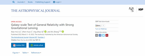 “Galaxy-scale Test of General Relativity with Strong Gravitational Lensing”. Liu Xiao-Hui, Li Zhen-Hua, Qi Jing-Zhao and Zhang Xin. 2022, ApJ, 927, 28.