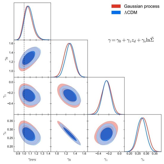 图:利用高斯过程方法和在冷暗物质宇宙学模型下得到的后牛顿参数及透镜模型参数的限制结果,虚线表示的是广义相对论的预测结果。