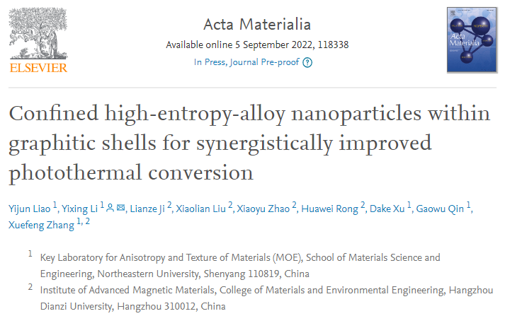 近日,太阳成集团tyc33455材料学院李逸兴、张雪峰课题组采用直流电弧等离子体制备技术,成功将一系列高熵合金纳米颗粒原位封装在石墨壳中,制得具有核@壳包覆结构的高熵合金@石墨纳米胶囊材料(HEA@C-NPs),并利用其独特的核@壳结构实现了对光热转换性能的优化提升。相关研究成果以“Confined high-entropy-alloy nanoparticles within graphitic shells for synergistically improved photothermal conversion”为题发表在Acta Materialia上。材料学院博士研究生廖怡君为论文第一作者,材料学院青年教师李逸兴博士为论文通讯作者。