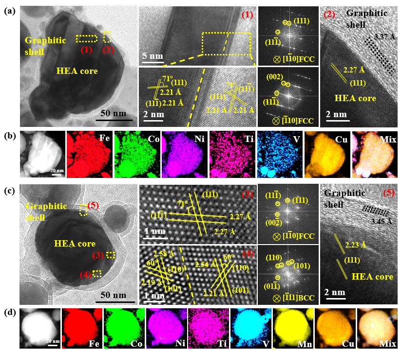 图1.微观结构表征。(a)-(b)FeCoNiTiVCu@C和(c)-(d)FeCoNiTiVMnCu@C的高分辨透射电镜(TEM)照片、快速傅立叶变换(FFT)以及对应的EDS元素分布。