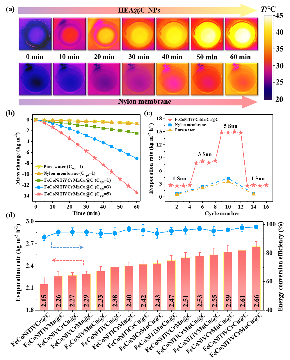 课题组对其进行相关光学吸收和光热转换性能测试,结果表明,随着复合组元增多,材料的光热转换性能增强。其中,8-HEA@C-NPs(FeCoNiTiVCrMnCu@C)在250—2500 nm波长范围的平均吸收率超过95%;在1个太阳光(1kWm-2)辐照下,可在90 s内从室温迅速升高至105℃,太阳光水蒸发速率和能量转换效率分别高达2.66 kg m-2h-1和98%,可见其具有优异的光响应和光热转换特性。