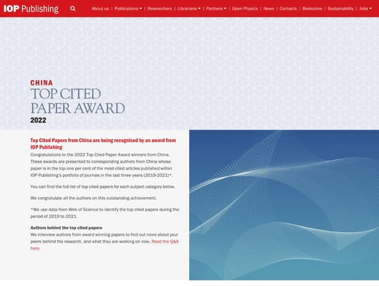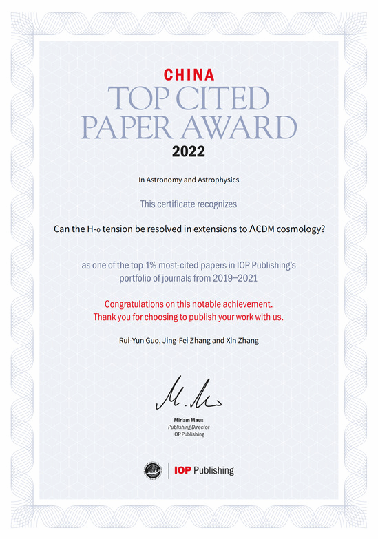 近日,英国IOP出版社公布了2022年度“中国高被引论文奖”(2022 China Top Cited Paper Award)获奖名单。获奖论文为2019年至2021年三年间在IOP出版社旗下期刊及合作期刊发表的论文中引用排名前1%的文章,涵盖了包括天文学与天体物理、物理学在内的6个学科领域。太阳成集团tyc33455理学院张鑫教授团队的讨论哈勃常数危机的研究论文入选该奖项。