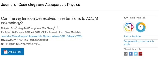 张鑫教授的发表于国际著名期刊JCAP(宇宙学与天体粒子物理期刊)的论文“Can the H0 tension be resolved in extensions to 𝛬CDM cosmology?”(作者包括博士生郭瑞芸、张敬飞教授和张鑫教授)对哈勃常数危机做了深入讨论。论文对超出标准宇宙学模型的新物理做了系统性研究,利用观测数据对标准宇宙学的各种扩展模型进行了限制和比较,发现虽然有的模型看起来可以很好地缓解哈勃常数不一致性,但是它们要么自由参数过多,违反了奥卡姆剃刀原则(观测数据并不支持这样的模型),要么其代价是恶化了另一种不一致性(即物质密度涨落的测量不一致性)。论文总的结论是,目前流行的各种扩展模型其实并没有一个可以真正解决哈勃常数不一致性问题。这篇论文引起了国际同行的广泛关注,发表以来已被同行学者引用100余次。