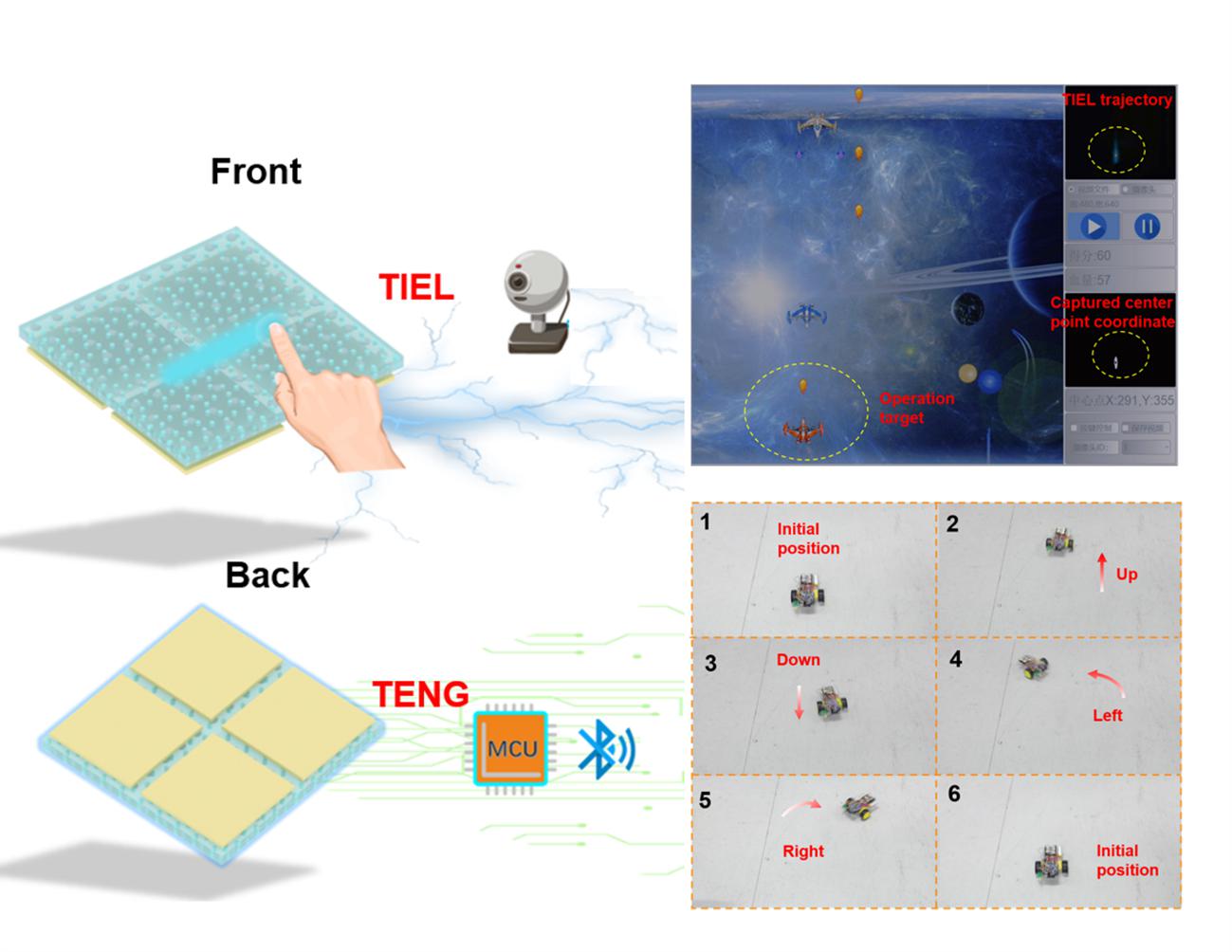 图一为SPTS的结构及在人机交互系统中的应用。其能够通过TIEL和TENG将触摸刺激同时转换为可见光和电信号,以实现对智能小车及视频游戏的远程控制。