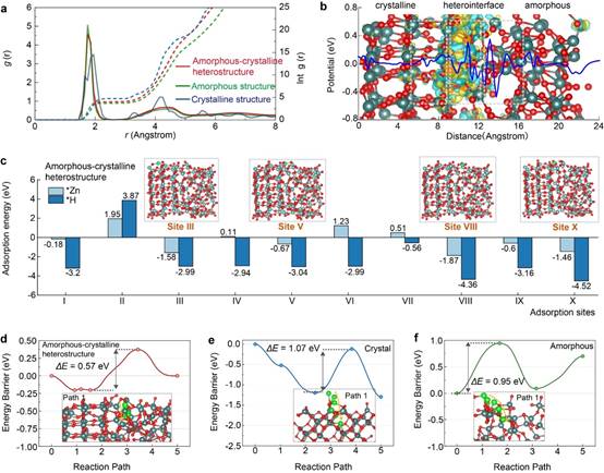理论计算表明,异质结构氧化钒的V-O配位结构与结晶态或无定型氧化钒不同,这是导致其电化学性能差异的重要因素。非晶-晶型界面的差分电荷密度图显示,非晶-晶型界面处的电荷分布不均,诱导形成内部电场,从而加速电荷载流子迁移。同时,由于表面重构,异质结构的表面拥有更多的端基O,*Zn和*H原子可能与界面附近的这些O位点结合;第二,与晶体和非晶对应物相比,异质结构氧化钒材料更易于吸附Zn2+、H+,尤其是在异质界面上,这些阳离子吸附活性位点可以促进电极材料的电荷转移反应。