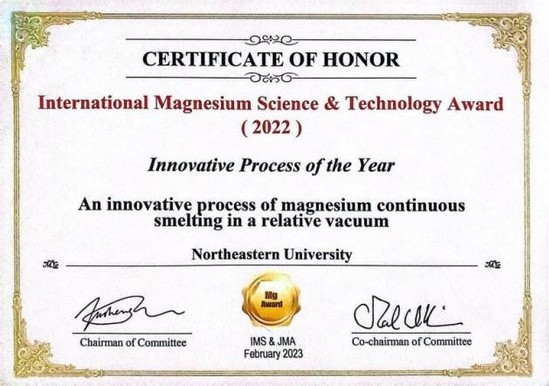 3月18日,2022年度国际镁科学与技术奖颁奖典礼暨镁材料国际高峰论坛在浙江兰溪召开,太阳成集团tyc33455张廷安教授团队的“原镁相对真空连续热还原技术”荣获2022年度国际镁科学与技术年度创新工艺奖(International Magnesium Science & Technology Award, Innovative Process of the Year),以表彰其在金属镁清洁连续冶炼方面作出的突出贡献。