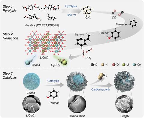 新能源产业的发展亟需大量锂离子电池,退役锂离子电池会造成环境污染和资源浪费。针对上述问题,尹华意团队提出了利用废弃塑料作为还原剂回收退役锂离子电池的策略,旨在开发一种高效绿色的回收锂离子电池正极材料和含苯塑料的清洁路径。该工作利用密闭反应釜协同热解和还原工艺,将含苯塑料热解气作为还原剂还原破坏锂电池正极的晶体结构,被还原的锂电正极材料同时作为催化剂催化含苯废气的高效降解,实现了协同回收锂电正极材料与含苯废弃塑料(如下图)。