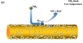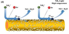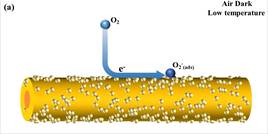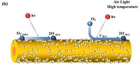 WS2传感器在(a, c)黑暗和低温以及(b,d)光激发和高温条件下的光增强传感机理示意图