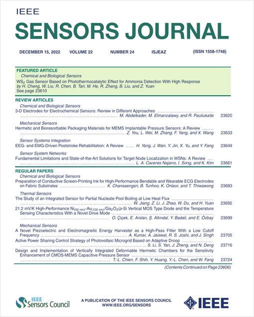 IEEESensors Journal 于2001年创刊,是传感器工程和技术领域的权威期刊,征稿涉及信号处理与分析、通信、网络与广播技术、元件、电路、器件与系统以及机器人与控制系统等和传感器技术密切相关的主题。IEEE Sensors Journal的2022年影响因子为4.325,JCR分区Q1。自2020年以来,IEEE Sensors Journal每期会选出一篇特色文章(Featured Article),以此来推广热点话题和优秀文章,被选出的文章将在6个月内免费开放(Open Access)。