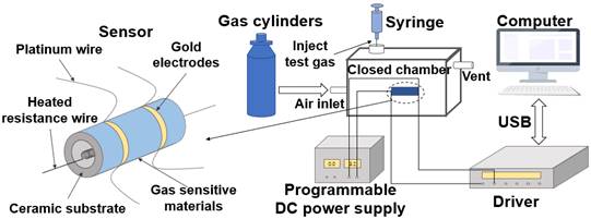 陶瓷底座的气体传感器结构示意图和气体测试平台示意图