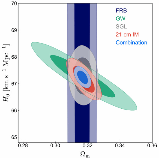 图:21厘米强度映射巡天、引力波标准汽笛、快速射电暴和强引力透镜的协同观测对宇宙学参数的限制。21厘米强度映射观测在其中发挥主导性作用。取自JCAP 06 (2023)052。