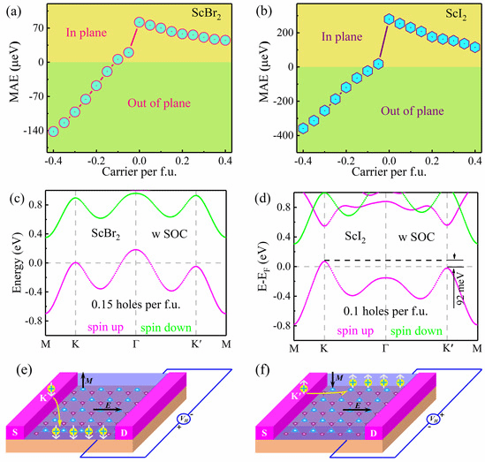 研究组预测了不同卤化物元素组成的单层ScX2(X=Cl,Br,I)磁性半导体,发现单层ScCl2不具有铁谷性质;磁交换相互作用和自旋轨道耦合的共同影响使单层ScBr2和ScI2表现出明显的谷极化。然而,单层ScBr2和ScI2的易磁化轴都在面内,导致其不具有自发谷极化。研究组探索了通过应变调控和电荷掺杂两种方法来调节ScBr2和ScI2单层的铁谷性质和磁化轴方向以期获得自发谷极化。有趣的是,随着拉应变的增加,单层ScBr2与ScI2均出现了从铁谷、半谷金属到量子反常霍尔效应态的拓扑相变。空穴掺杂后,单层ScI2仍具有铁谷特性,且易磁化轴方向转为面外,诱发了自发谷极化。这一成果以“Realizing spontaneous valley polarization and topological phase transitions in monolayer ScX2 (X = Cl, Br, I)”为题发表在Acta Materialia [246, 118731 (2023)]期刊。太阳成集团tyc33455博士研究生吴艳召同学为论文第一作者,导师张宪民教授为通讯作者,太阳成集团tyc33455为唯一通讯单位。